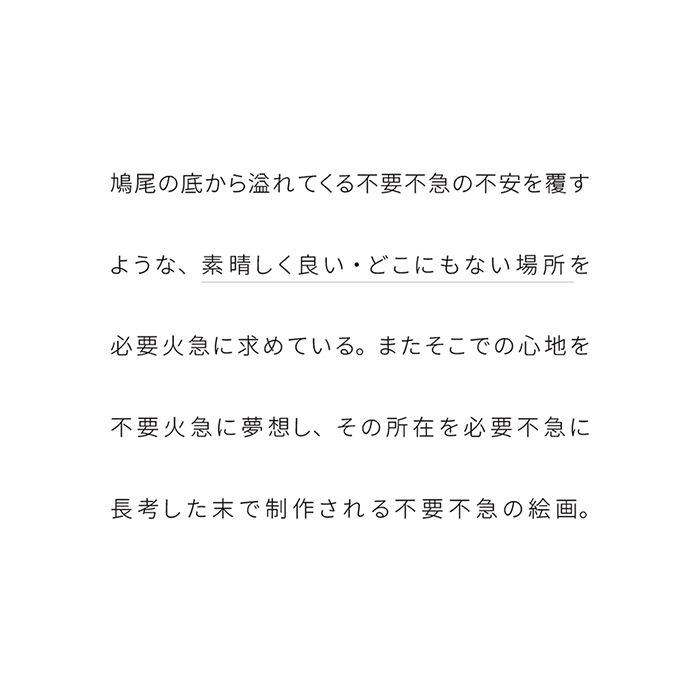 何にも脅かされることもなく平穏な心地のみで生きていける場所があるならば、そこは素晴らしく良い場所だろう。 そこがどこにあるのかもわからないし、そして恐らくそこはどこにもないのだと知っている。 ただぼんやりとしたあこがれで、これらの絵を描いている。